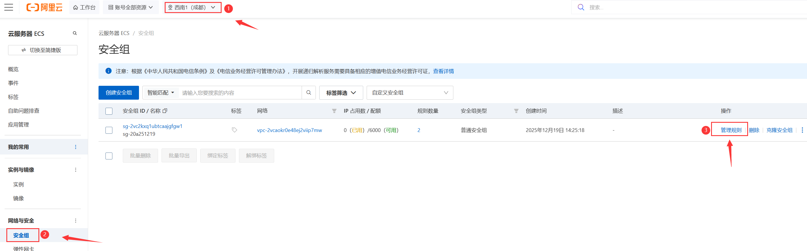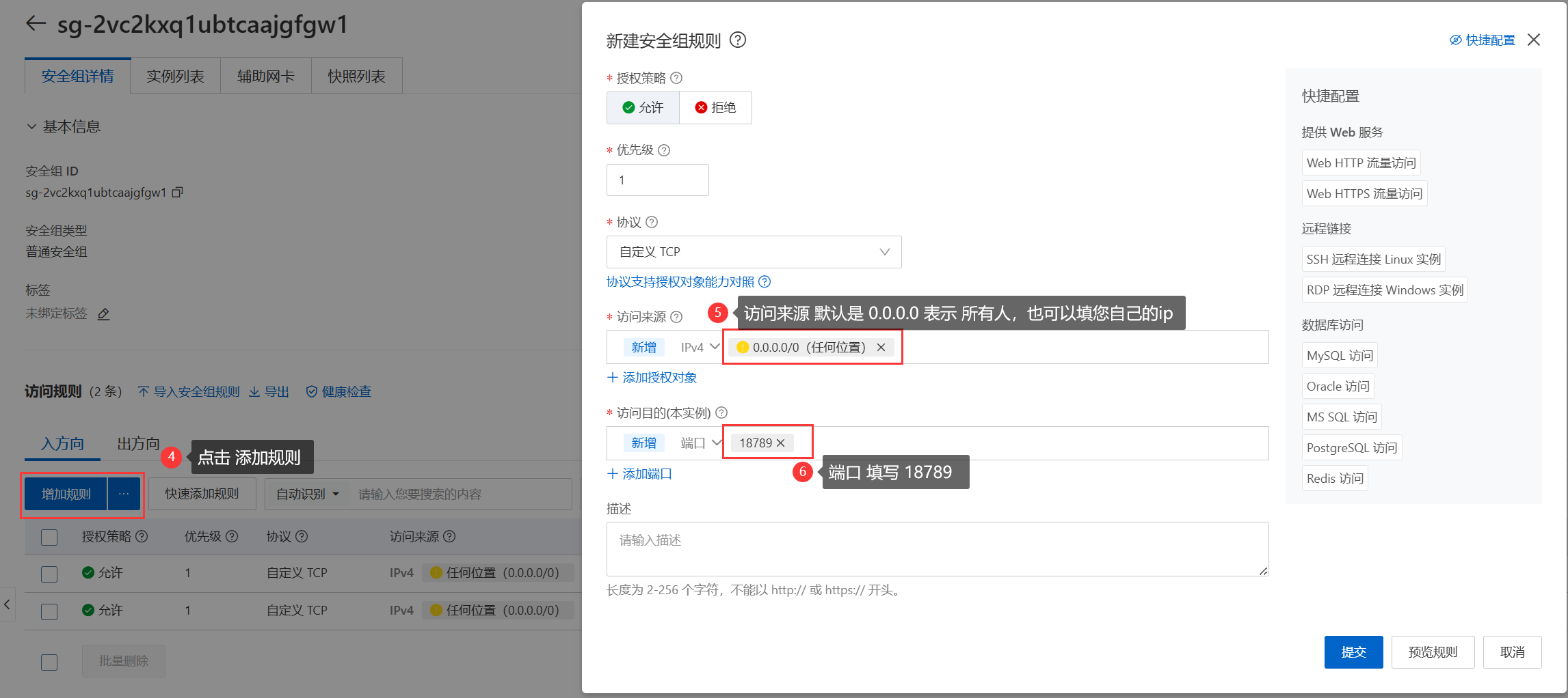1、切换到 实例所在区域 2、点击 左侧 安全组 3、点击 管理规则  4、点击 添加规则 5、访问来源 选择 0.0.0.0 表示对 所有人放行 可以填写自己的ip ,表示仅自己可用 (查看自己的ip https://ip138.com/) 6、端口 填写 18789