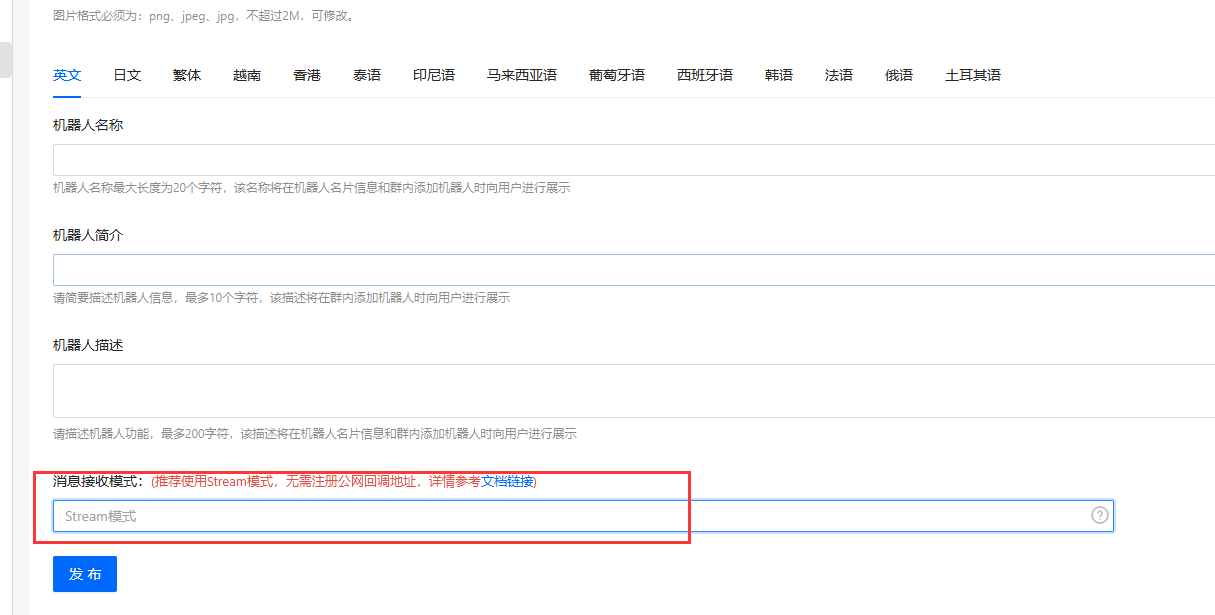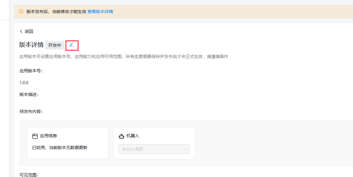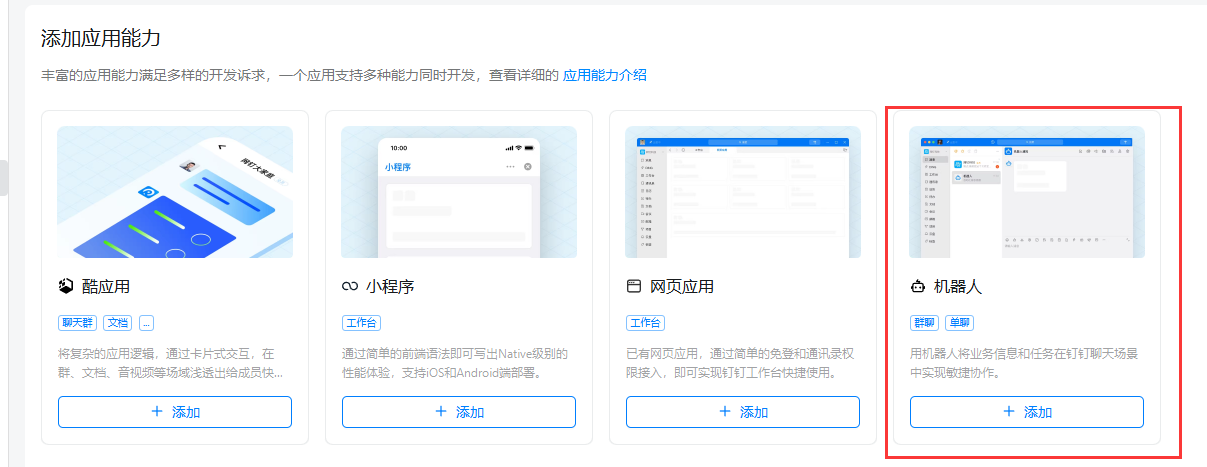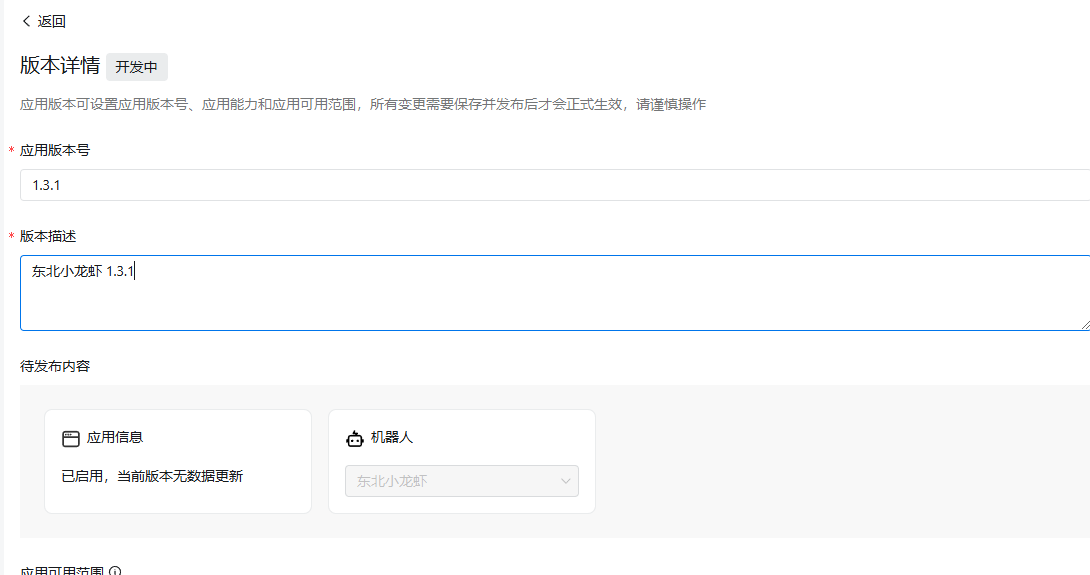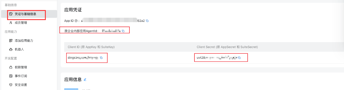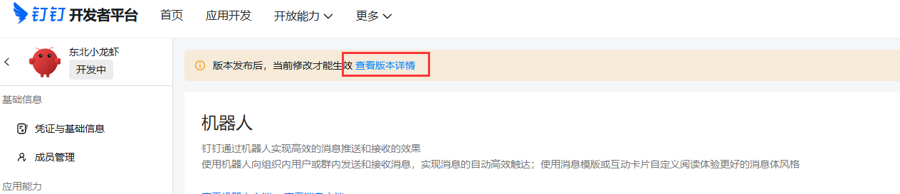 1、登录钉钉开发平台 https://open-dev.dingtalk.com/ 2、点击 应用开发 - 企业内部应用 - 钉钉应用  3、填写应用名称 - 描述- 头像等信息。 4、添加应用能力 - 机器人  5、选择机器人配置 - 配置机器人基础信息  6、消息接收模式选择默认的Stream方式,点击 发布  7、拉回顶部 - 点击 查看版本详情  8、点击 版本详情 -后面的修改图标  9、填写版本 和应用信息  保存后发布  OpenClaw配置Channel 点击 机器人进去 - 或者如下信息 记录。 Client ID 原AppKey Clent Secret 原AppSecret Robot Code 与Client ID相同 Corp ID 企业ID Agent ID 应用ID  在应用的权限管理页面,需要开启以下权限: ✅ Card.Instance.Write — 创建和投放卡片实例 ✅ Card.Streaming.Write — 对卡片进行流式更新 ✅ 机器人消息发送相关权限 — 允许机器人向单聊/群聊发送消息 ✅ 媒体文件上传相关权限 — 允许调用媒体上传接口发送图片、语音、视频、文件